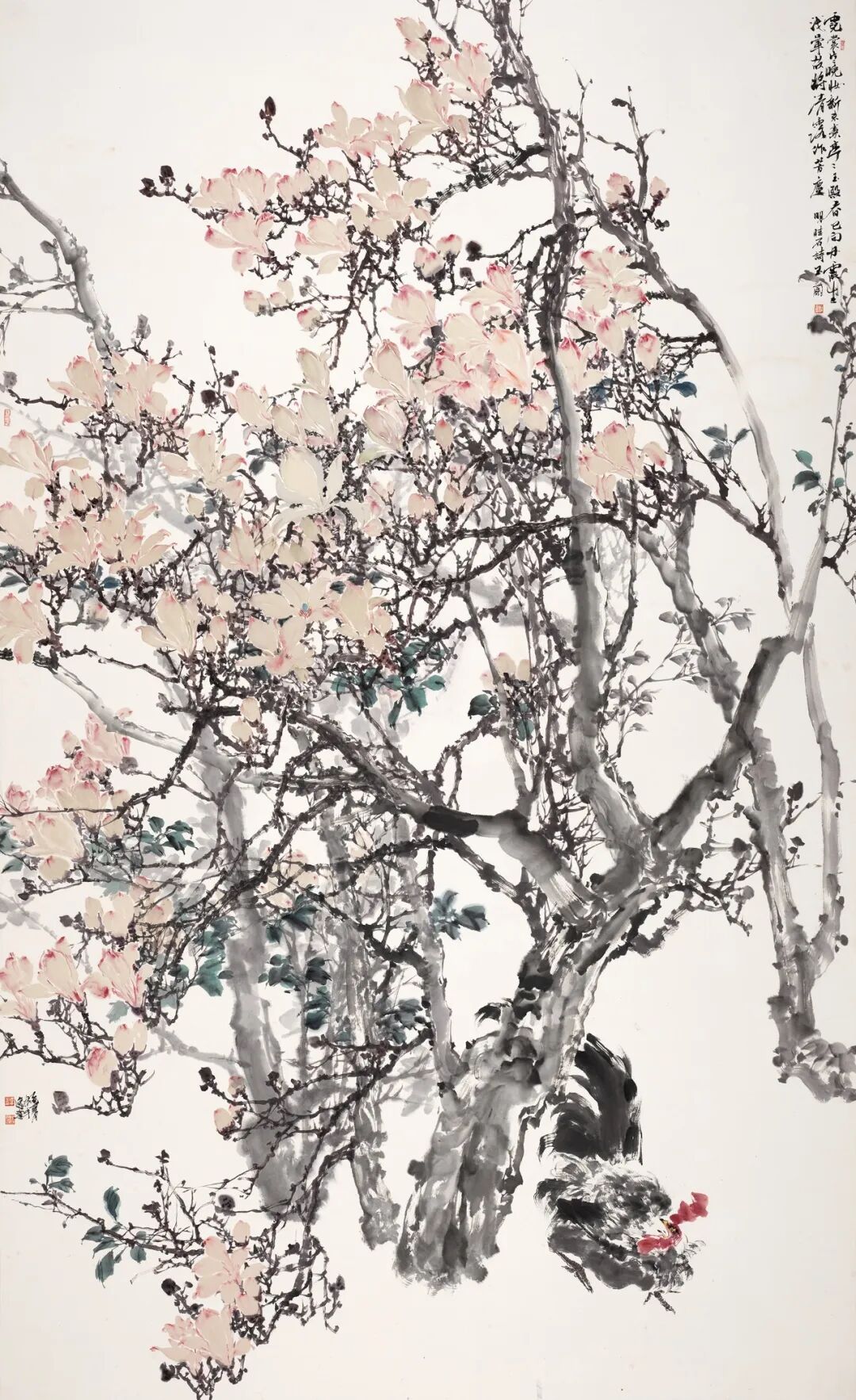 看似繁密的构图背后,有清晰的结构支撑。枝干的走向、花簇的聚散、禽鸟的分布,共同构成画面的节奏秩序。