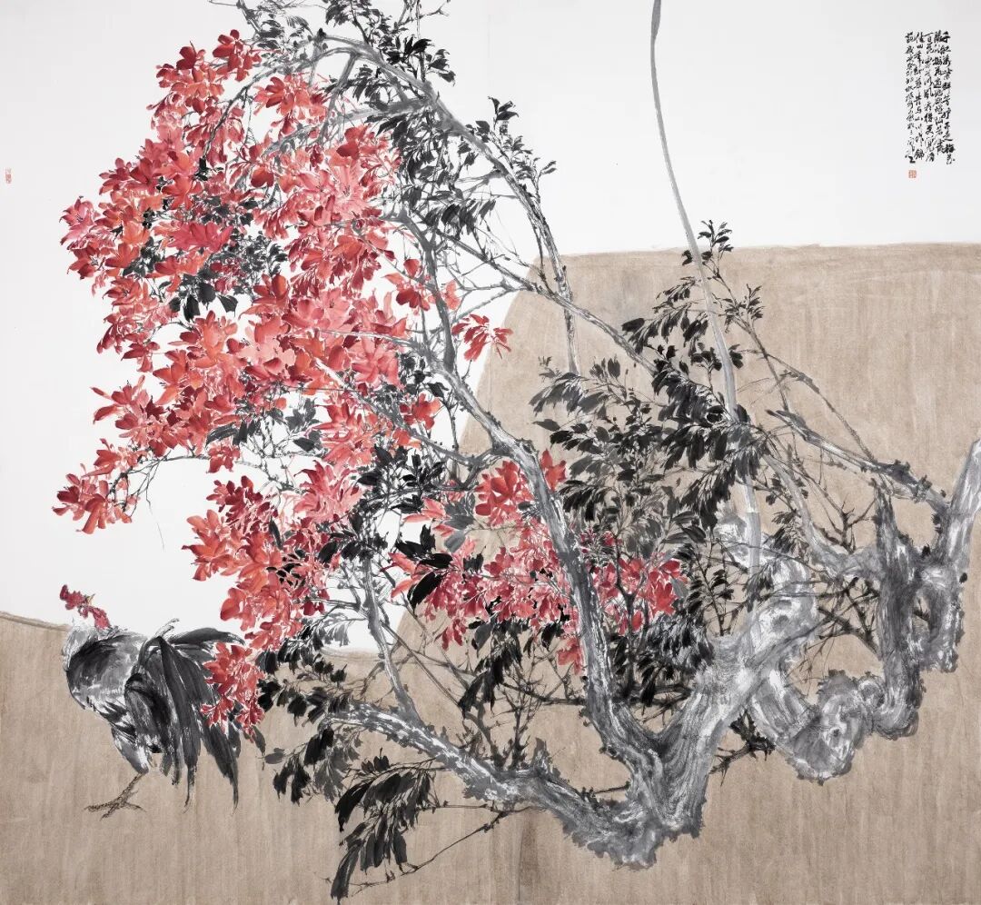 在当代花鸟画的语境中,他的创作呈现出一种鲜明而有力量的艺术气质——既有传统笔墨的根基,又充满生命喷涌般的表现力。