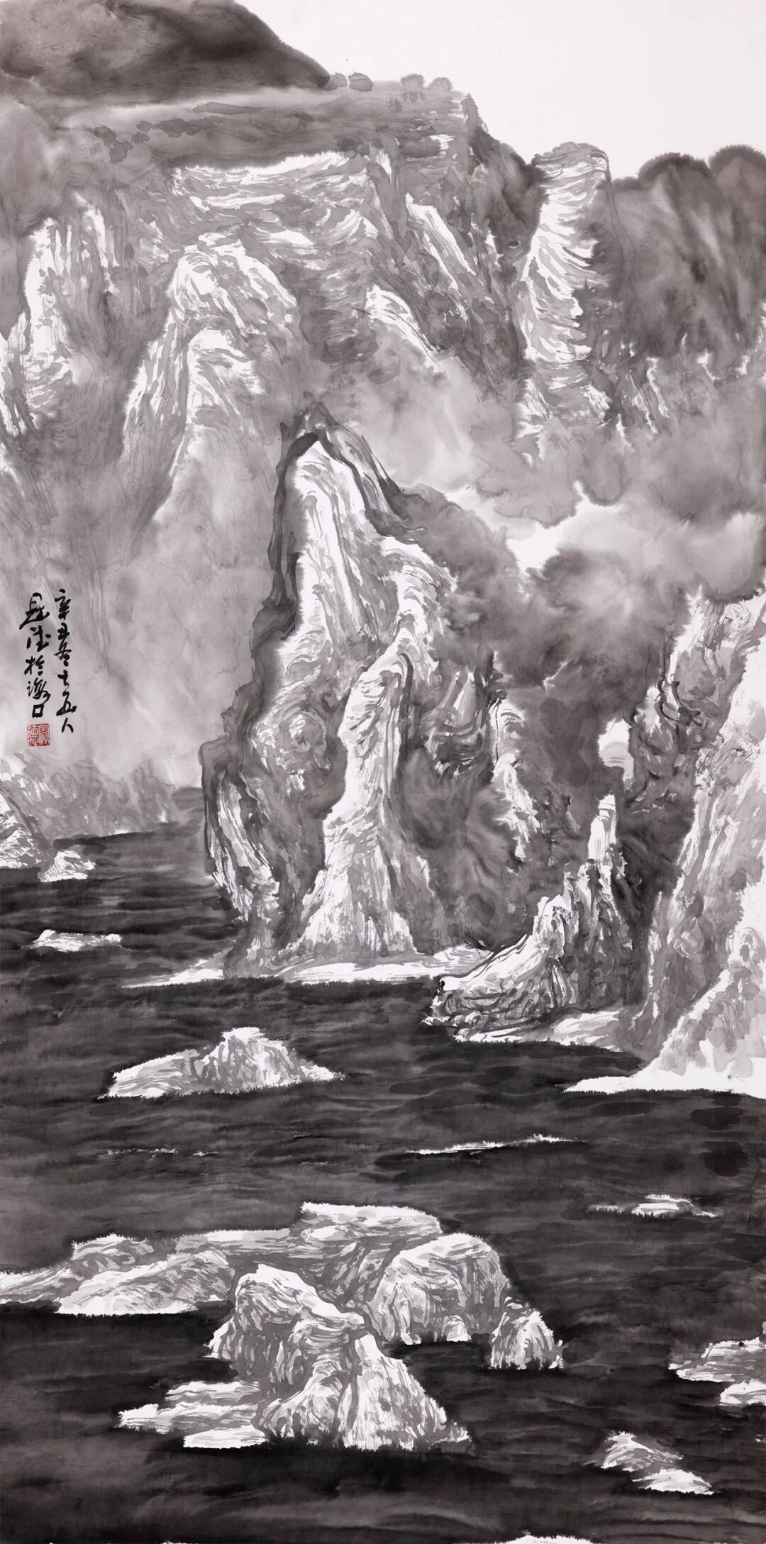 当代艺术家用重墨勾勒山的轮廓,再以淡墨层层皴擦,让山峦呈现出深浅不一的绿意,远处的山巅被一层薄薄的雾霭笼罩,仿佛能感受到山风拂过的凉意;近处的山石棱角分明,浓墨点染的苔藓在石缝间蔓延,像是给山石披上了一件清凉的外衣。