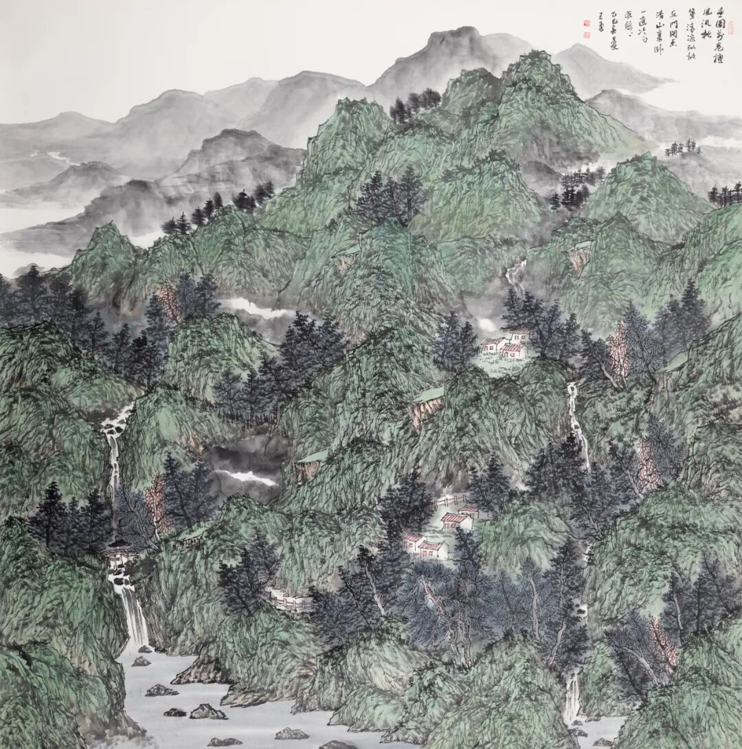 王勇以灵活的笔锋表现山林的湿润与生机,他用浓墨短皴勾勒岩缝,再以淡墨长皴晕染坡面,墨色过渡自然如晨雾漫过山脊,既守持了骨法用笔的传统,又赋予山石呼吸般的灵动,传统山水的空灵意趣,让古典文脉自然融入现代审美。