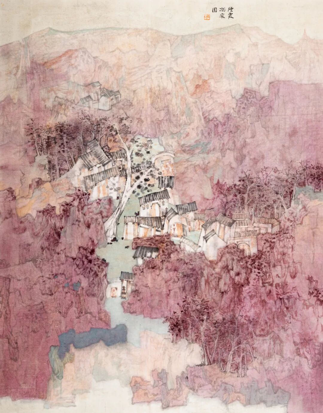 这幅山水画作色调温婉,以淡紫、浅粉等柔和色彩晕染出如梦似幻的山水景致。画面中,山峦连绵起伏,被朦胧的色彩所笼罩,尽显空灵悠远。错落有致的屋舍隐匿于山林间,一条蜿蜒小径串联其间,增添了生活气息与纵深感。