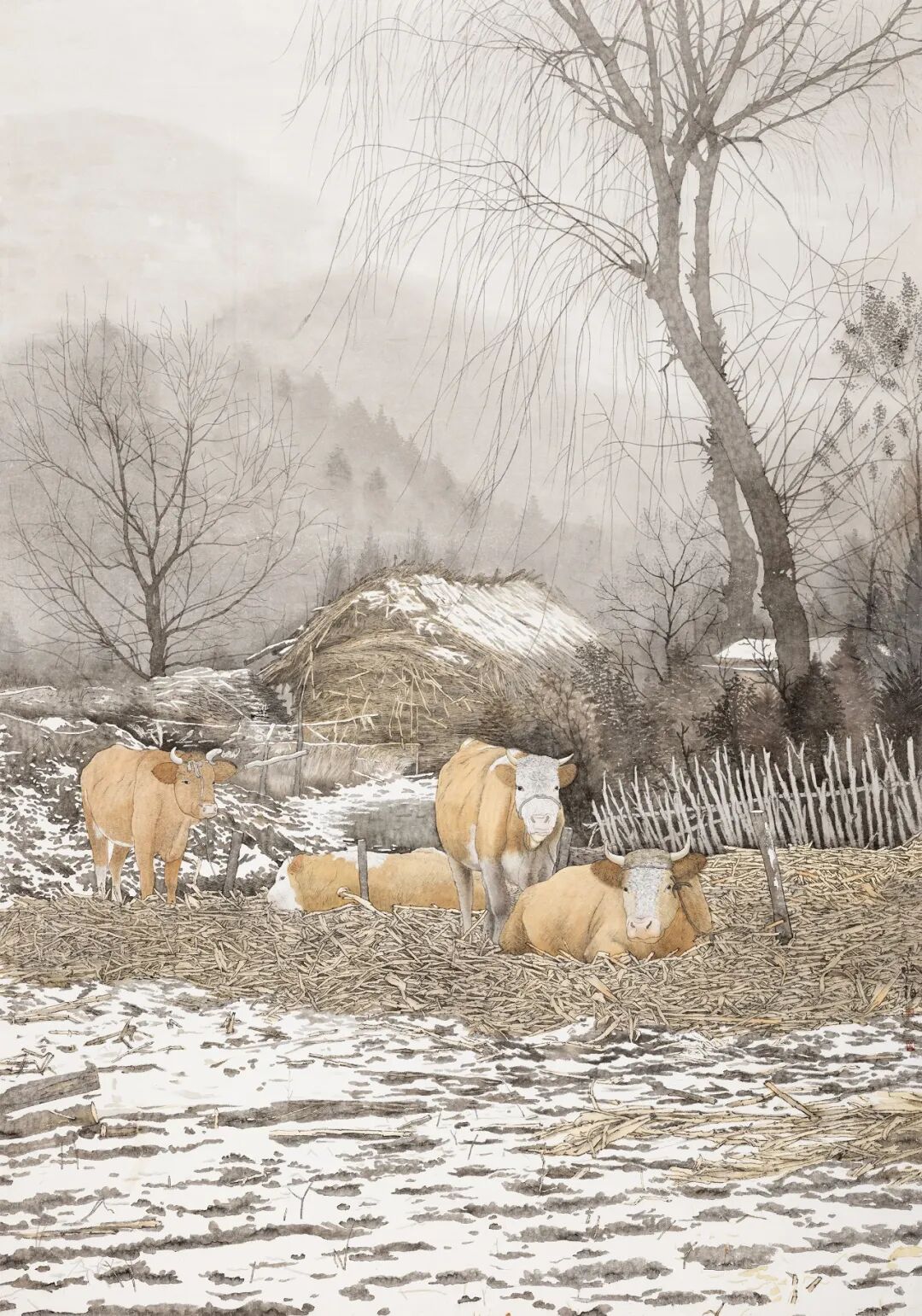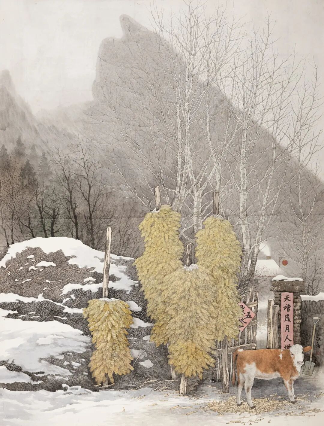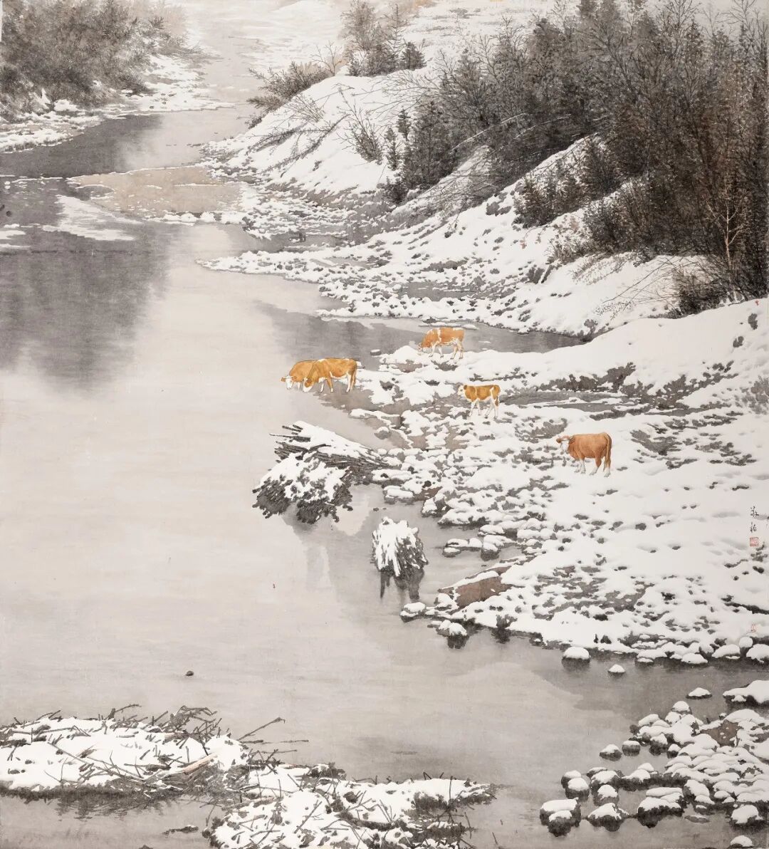 植根于关东沃土的牛敬柏,用画笔捕捉北国的四季轮转与人文精神。从《煤城春早》的工业记忆到《家山春早》的自然复苏,从《初雪》的静谧到《庆余年》的祥和,他的作品饱含着对黑土地的深情,在“凭君料理花间事”的细腻与“春满家山”的宏阔之间,奏响了生活的诗意与坚韧。